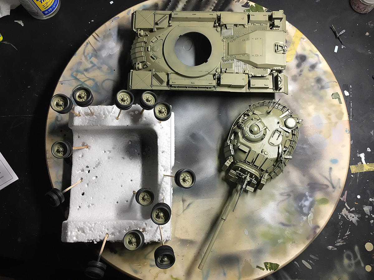 Základ je hotový a nyní si ukážeme patinovaný modelu. Celý postup s mým osobitým komentářem si můžete shlédnout ve videu níže. Na záznamu uvidíte aplikaci washe, nanesení pigmentů na tank a pásy, dry brush metodu a chipping.