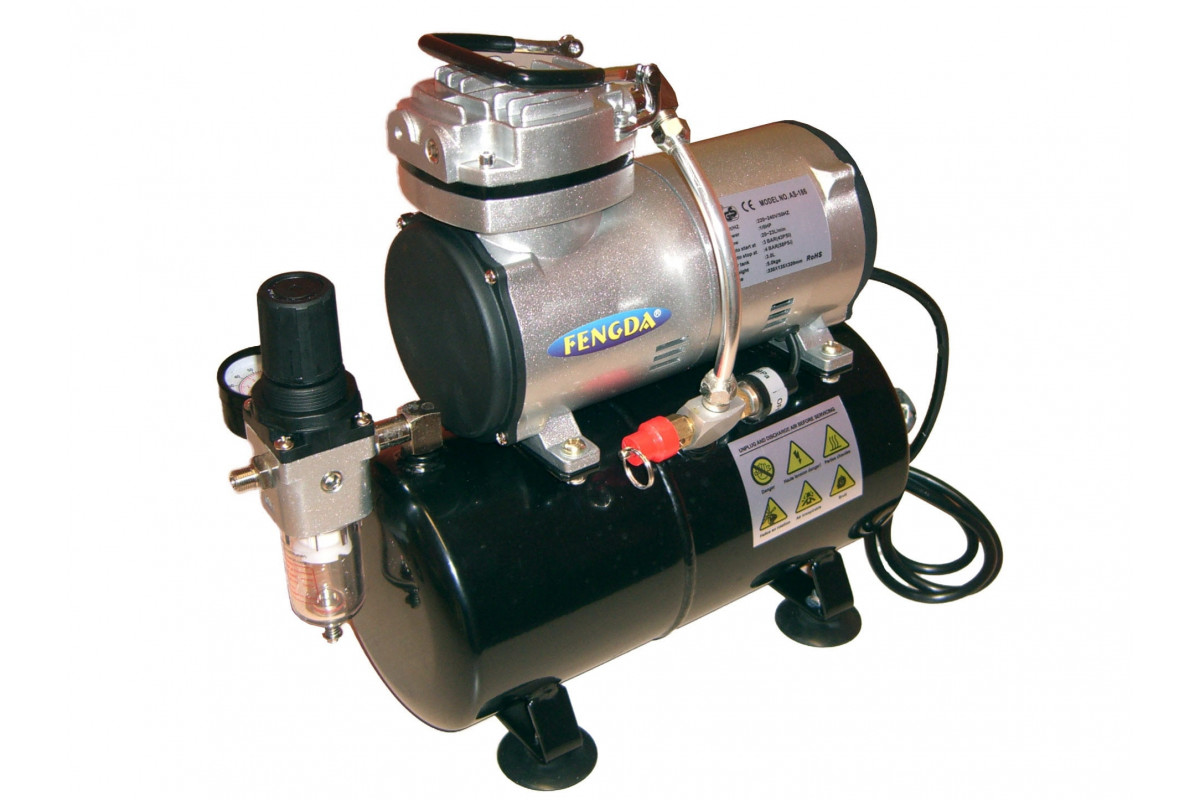Airbrush kompresor Fengda BD-186 je výkonný a kompaktní kompresor určený pro práci s airbrush pistolemi při barvení plastikových modelů, ilustracích i dalších hobby projektech.