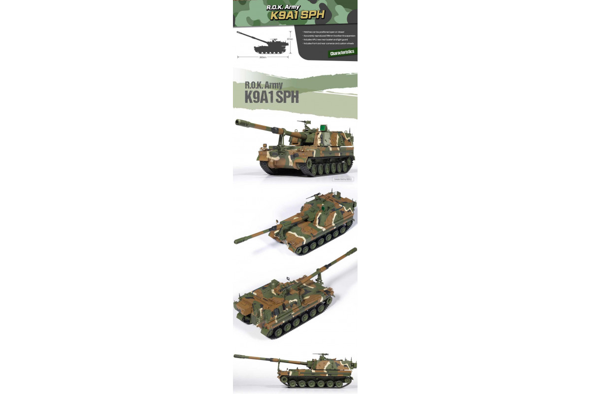 Model R.O.K. Army K9A1 SPH v měřítku 1:35 představuje moderní jihokorejský samohybný kanon. Stavebnice nabízí detailně zpracovaný trup, věž s dělem, realistické povrchové detaily a široké možnosti vystavení.