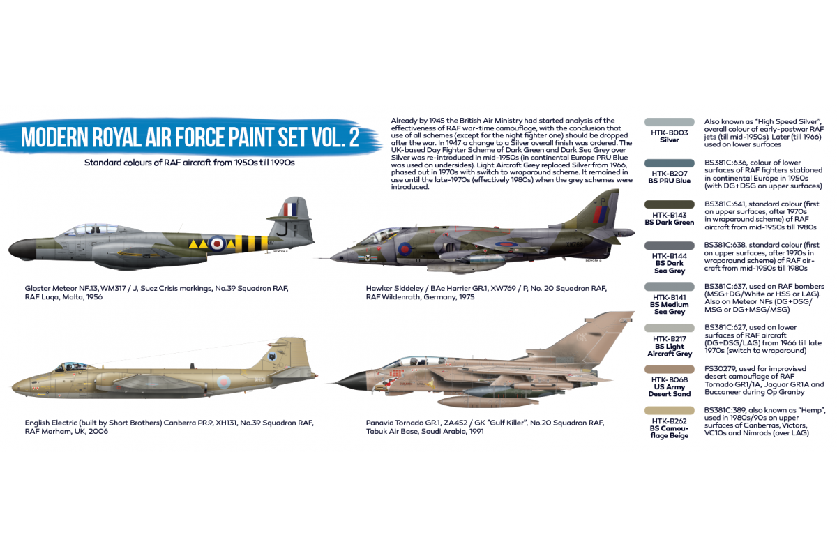 Standardní barvy letectva RAF od roku 1950 do 1990. Tyto barvy jsou již připraveny na použití. Před použitím je řádně promíchejte a následně nanášejte štětcem na povrch modelu. V případě potřeby přidejte akrylové ředidlo.