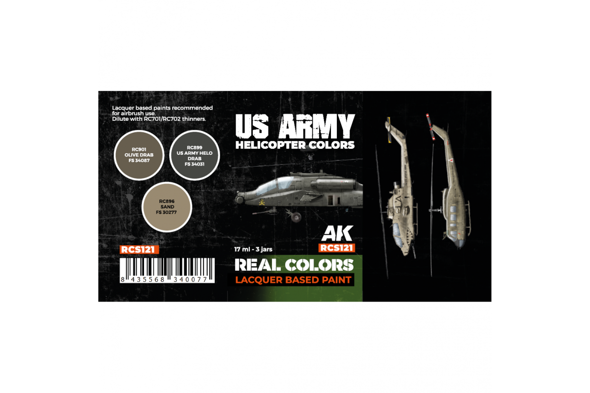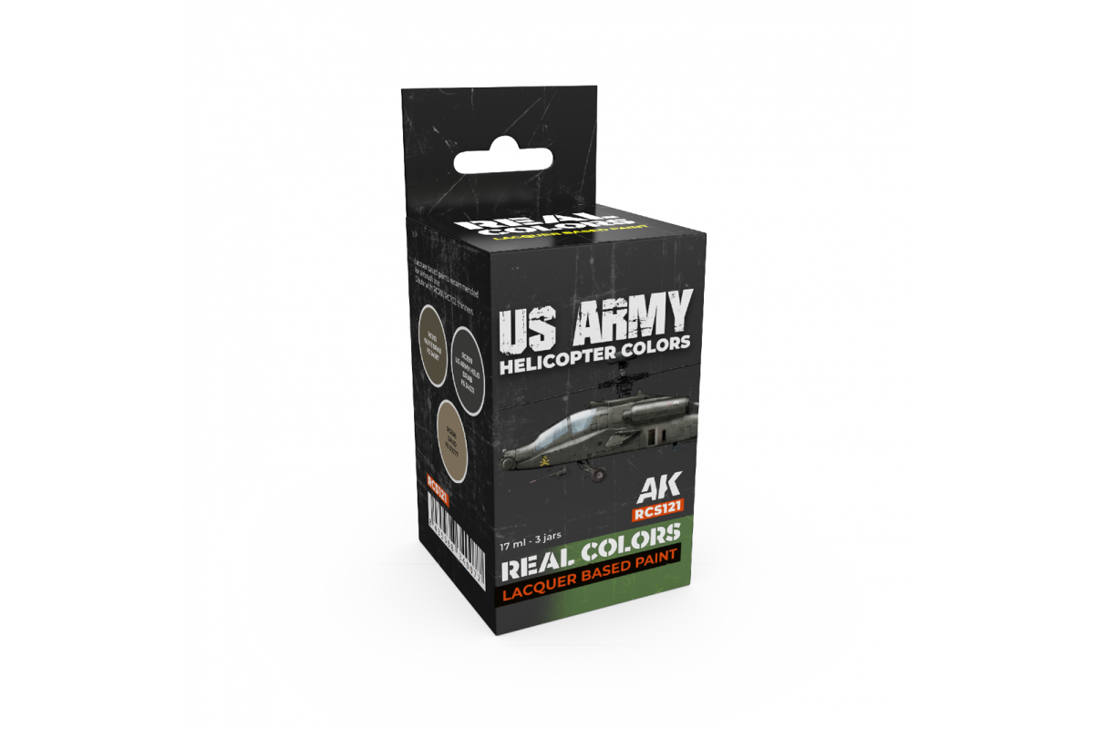 Sada Real Colors obsahující tři barvy, které jsou nezbytné pro barvení modelů vrtulníků americké armády používaných od 60. let 20. století. Obsahuje barvu FS 34087 používanou během války ve Vietnamu a po ní, FS 34031 zavedenou jako novou celkovou barvu v roce 1985 a FS 30277 dočasně používanou během války v Perském zálivu. Tato sada bude vaším dokonalým společníkem při barvení modelů takových strojů, jako jsou AH-1 Cobra, AH-64 Apache, OH-6 Kiowa, UH-1 Huey nebo UH-60 Blackhawk americké armády.