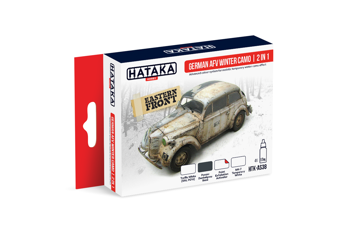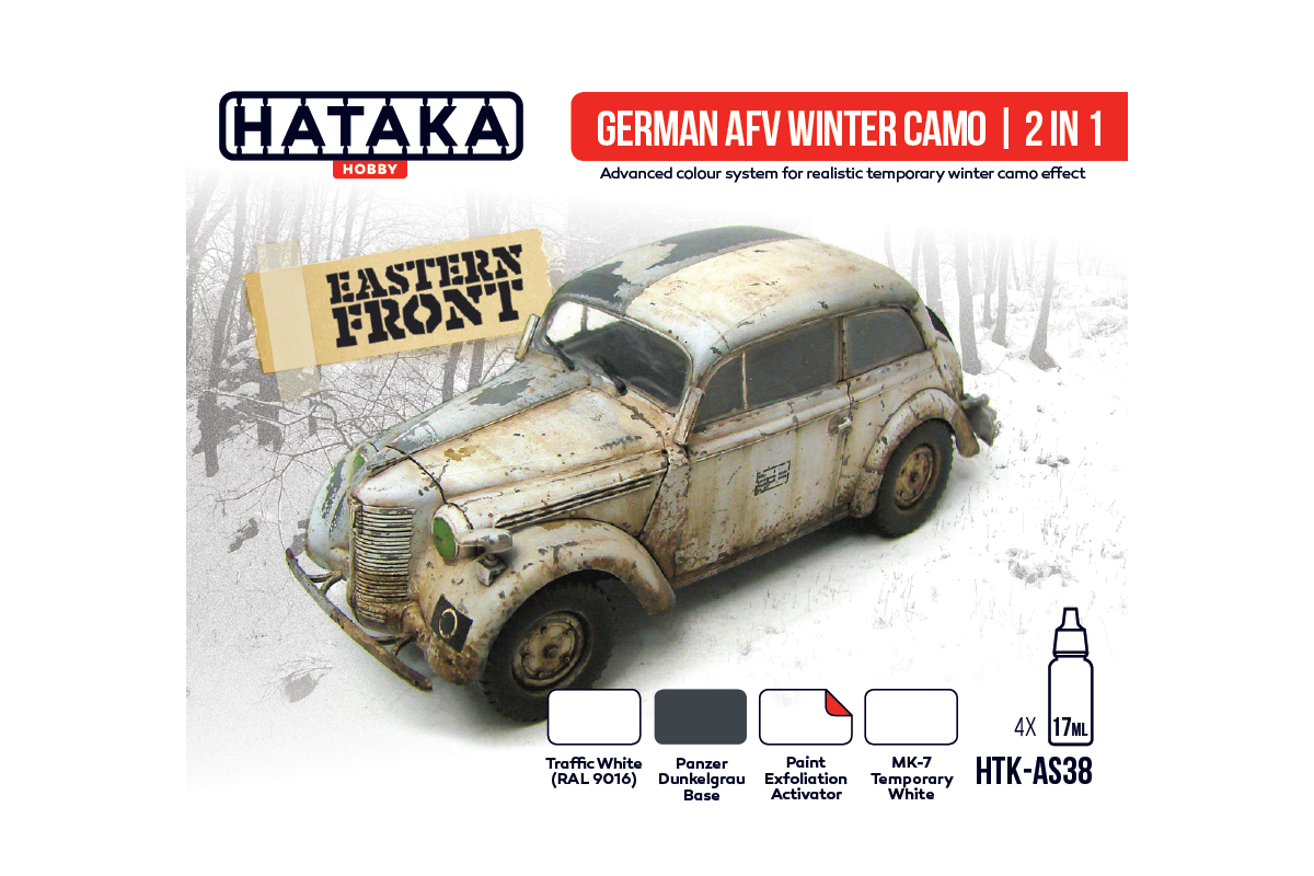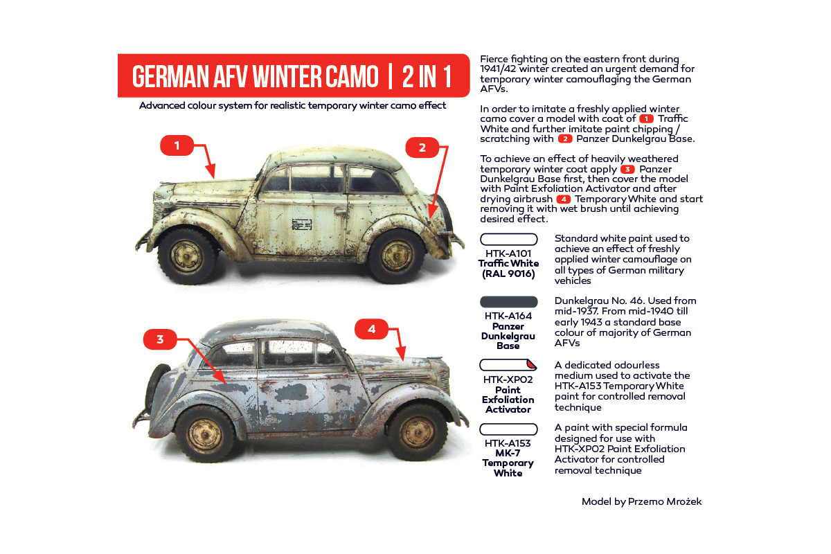 Speciální set barev na imitaci dočasné zimní kamufláže německé techniky. Tyto barvy jsou již připraveny na použití. Před použitím je řádně promíchejte a následně aplikujte přímo do airbrushové pistole. V případě potřeby přidejte akrylové ředidlo.