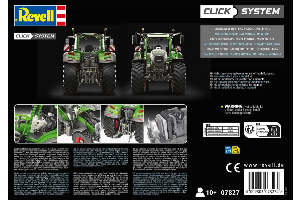 Díky snadnému systému Easy-Click lze model sestavit okamžitě po vybalení, což z něj činí ideální volbu pro začínající modeláře i pro ty, kteří chtějí rychlou stavbu. Model věrně zobrazuje charakteristické tvary a detaily moderního traktoru Fendt 728 Vario.